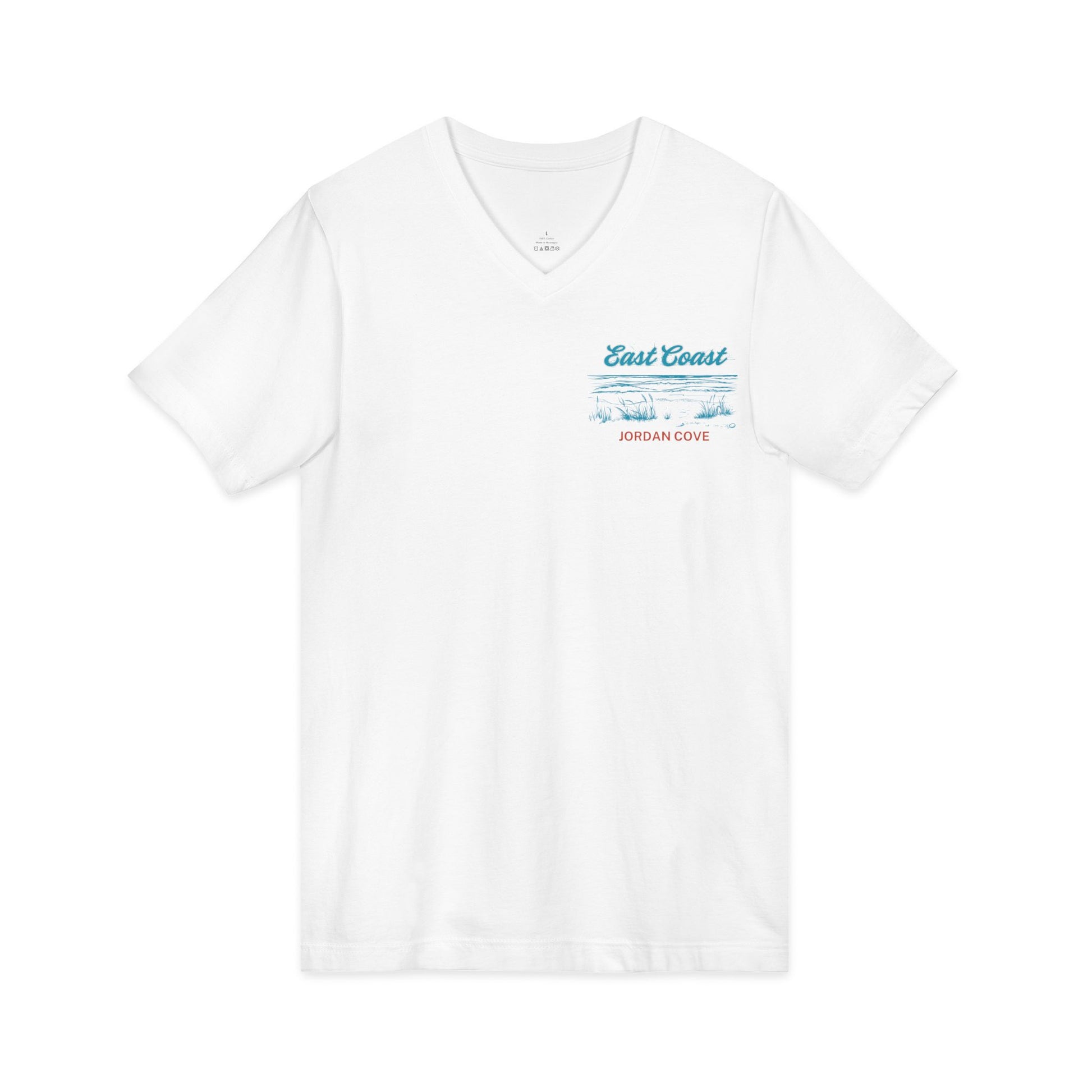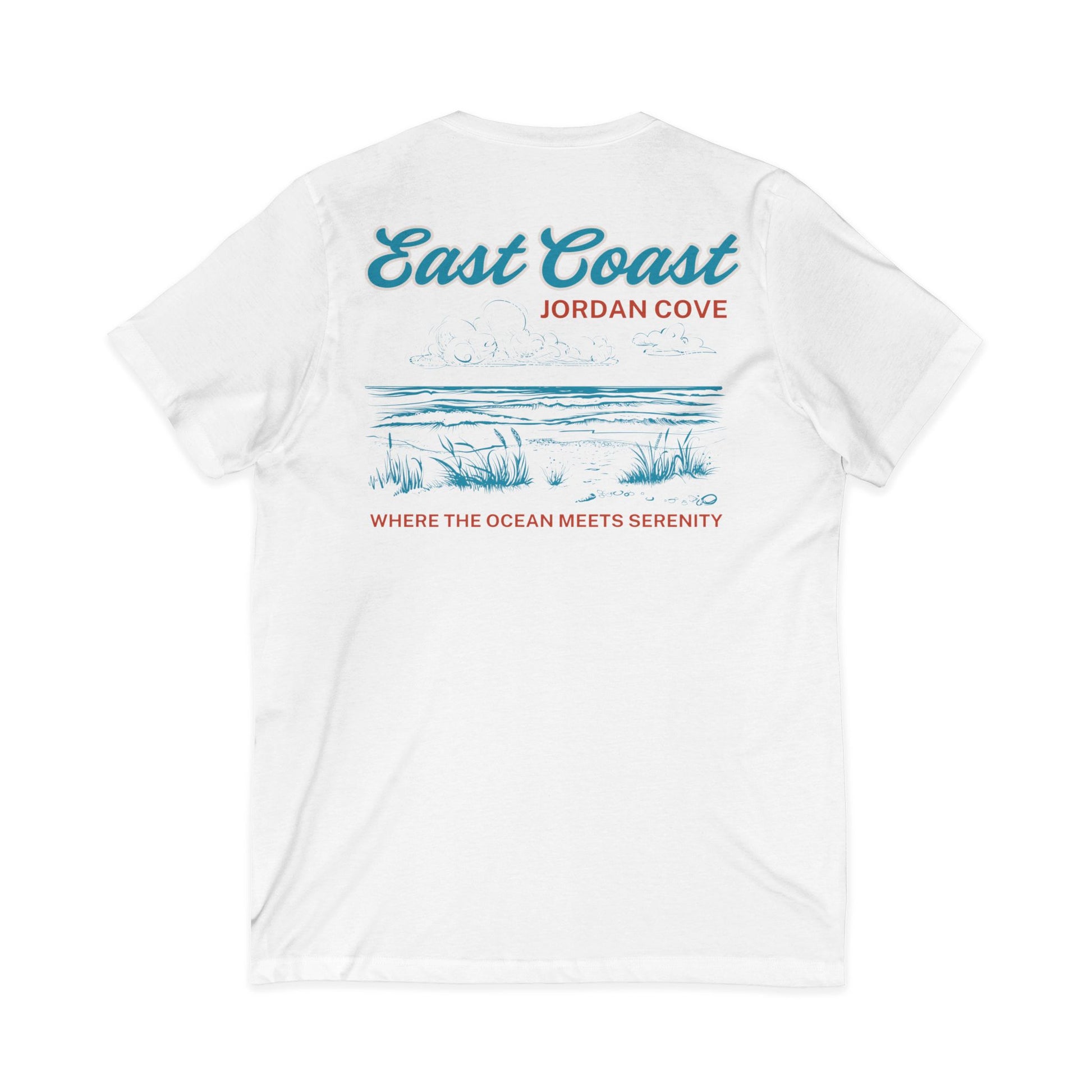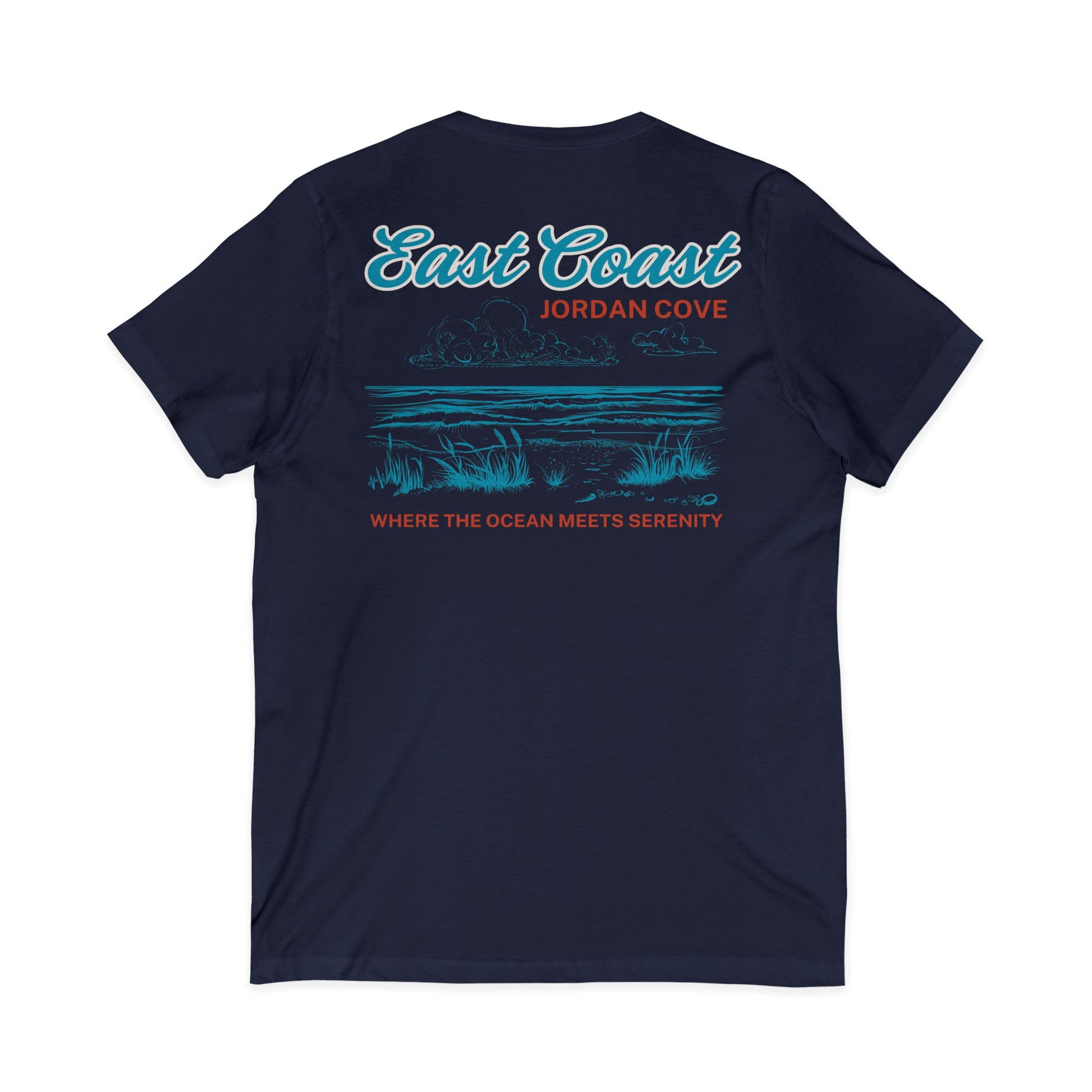 Lightweight and softly worn, this V-neck tee carries a quiet coastal mood—sea-salted breeze, low dunes, and the hush after sunset. The subtle chest script and larger back scene read like a tucked-away postcard from Jordan Cove: cursive ‘East Coast’, a gentle shoreline sketch, and the tagline ‘Where the ocean meets serenity’. It layers easily under a flannel or stands alone on warm evenings. Breathable 100% cotton (with heather blends available) and a retail V-neck silhouette keep the look pulled together without stiffness. Ethically made and built to keep its shape, this shirt becomes the one you reach for when you want a calm, familiar coast with you wherever you go.