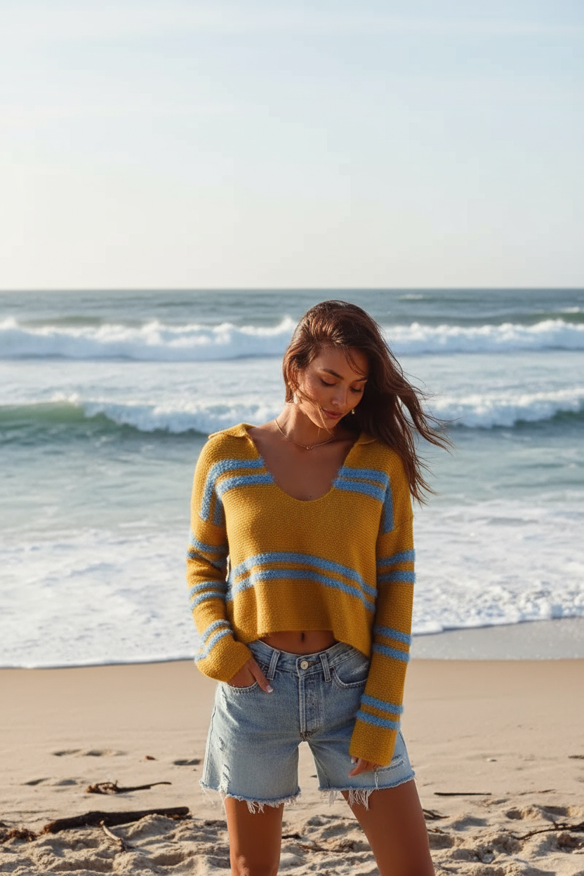 Stay cozy and chic in this fuzzy, hairy stripe deep U-neck sweater top. The unique texture of the fabric adds a fun and trendy flair to the classic silhouette. The deep U-neckline offers a modern and playful touch to the design. Perfect for adding a statement piece to your outfit, this sweater top is versatile and stylish. Embrace a comfortable and fashionable look with this eye-catching and cozy top.